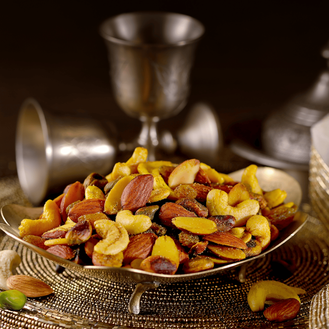 A slightly-tangy, slightly-sweet mixture of the finest roasted almonds, cashew nuts, pistachios, raisins and poppy seeds tossed in a secret spice mix, this flavoursome snack is a tea-time essential.